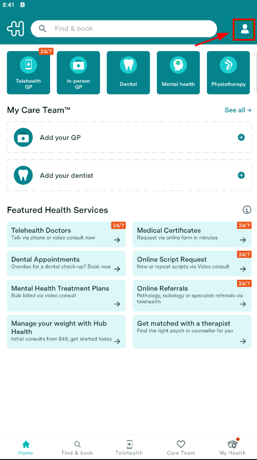 • Click the person icon in the top right corner of the app.