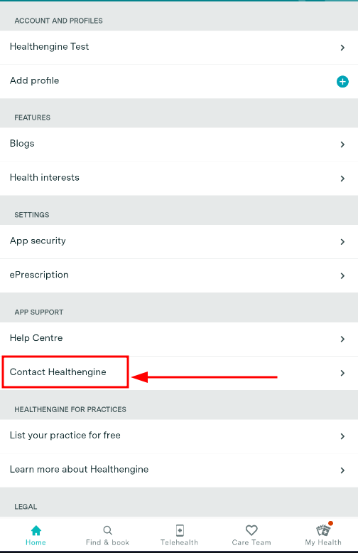 • Under "App Support," select "Contact Healthengine."