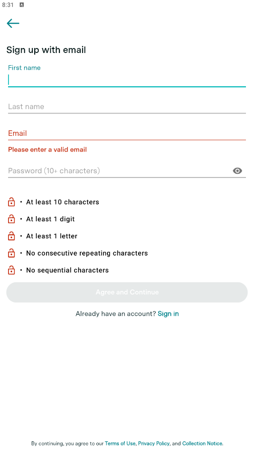 Please note: If you choose to sign up with your email account, you will be asked to fill in the following boxes with your first name, last name, email address, and desired password.