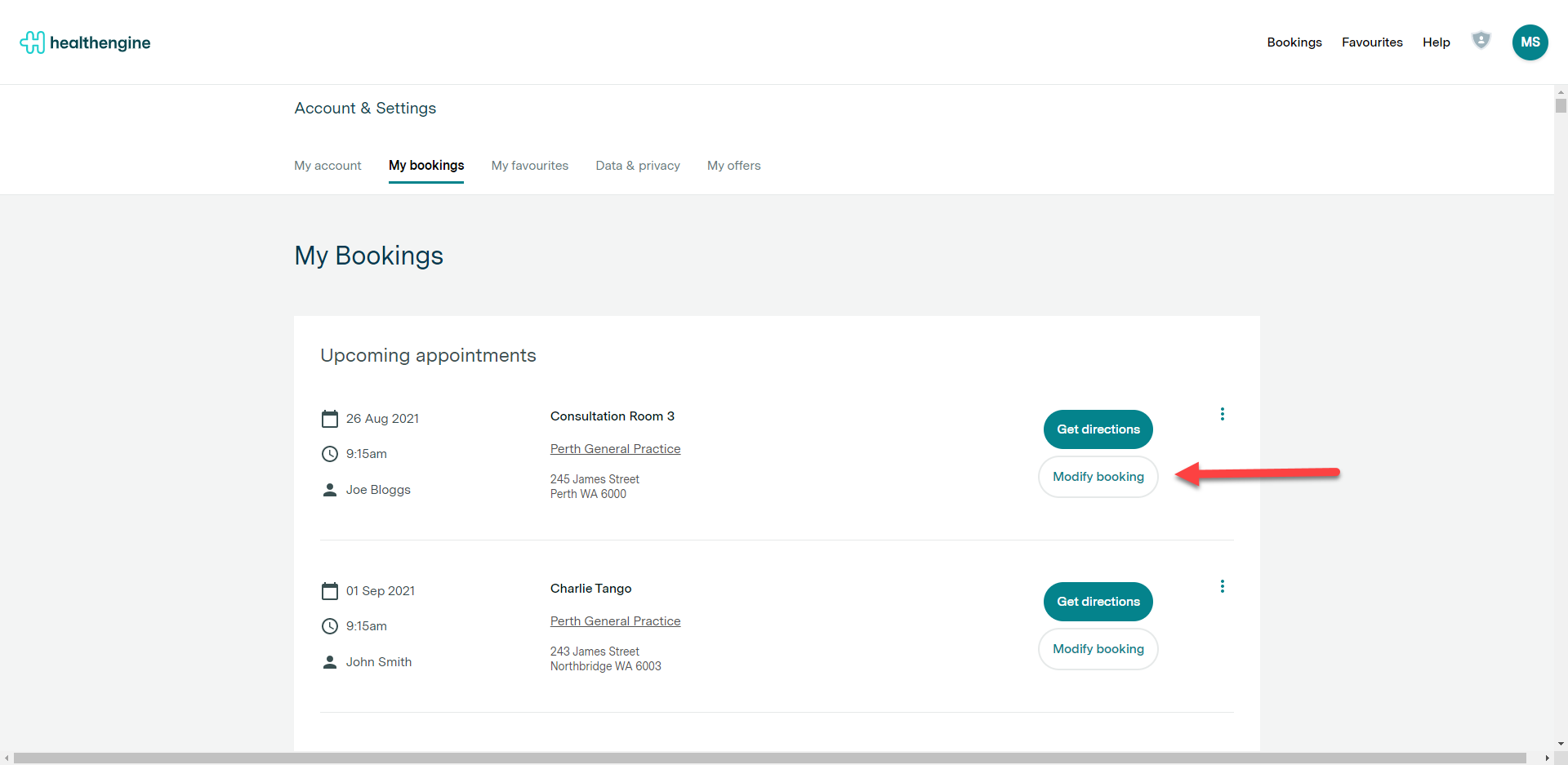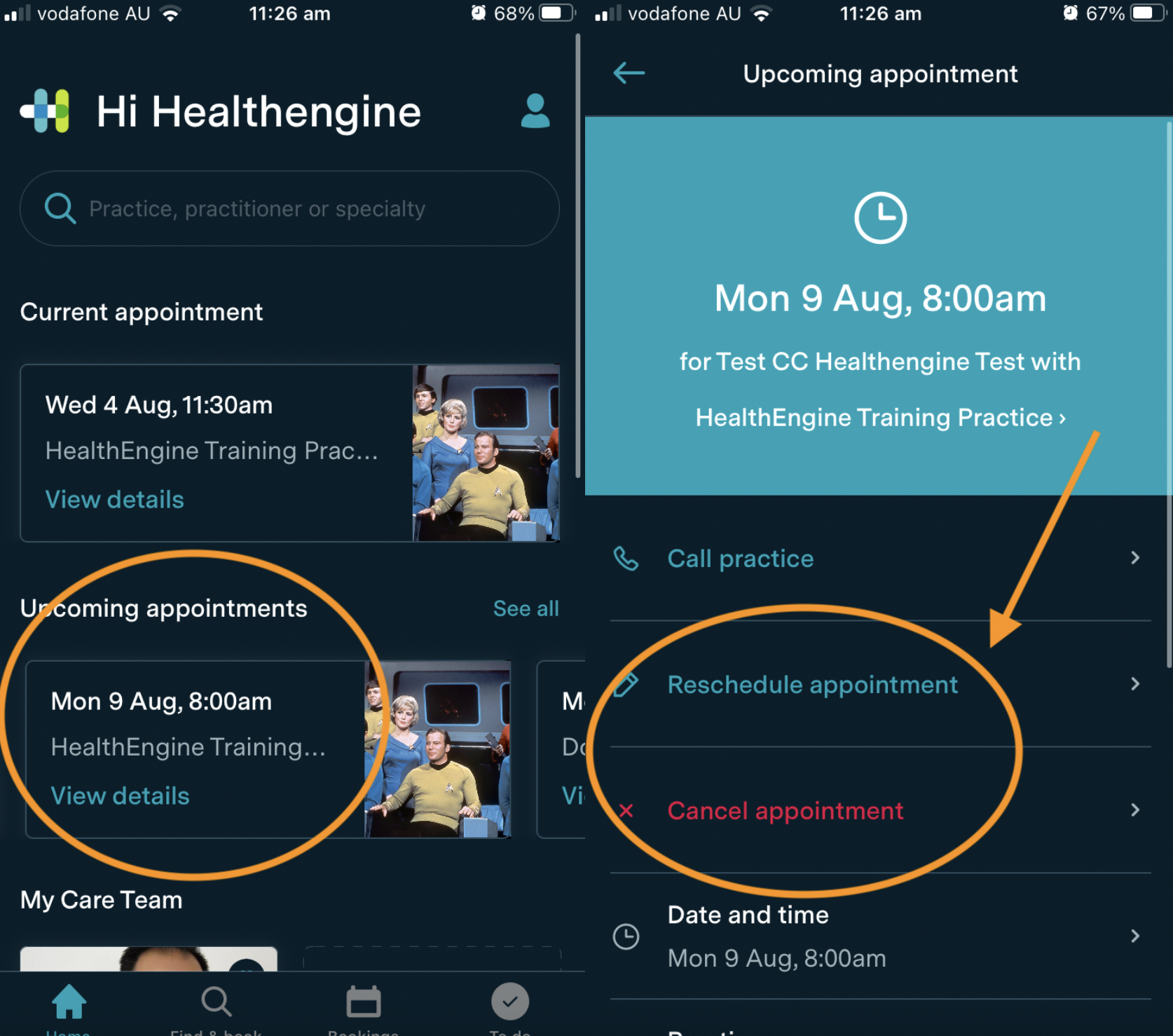 If you booked the appointment while you were logged into your HealthEngine patient account, you can also cancel or manage your appointment via the 'my bookings' screen on our website or under 'Upcoming appointments' on the 'home' screen of the app.