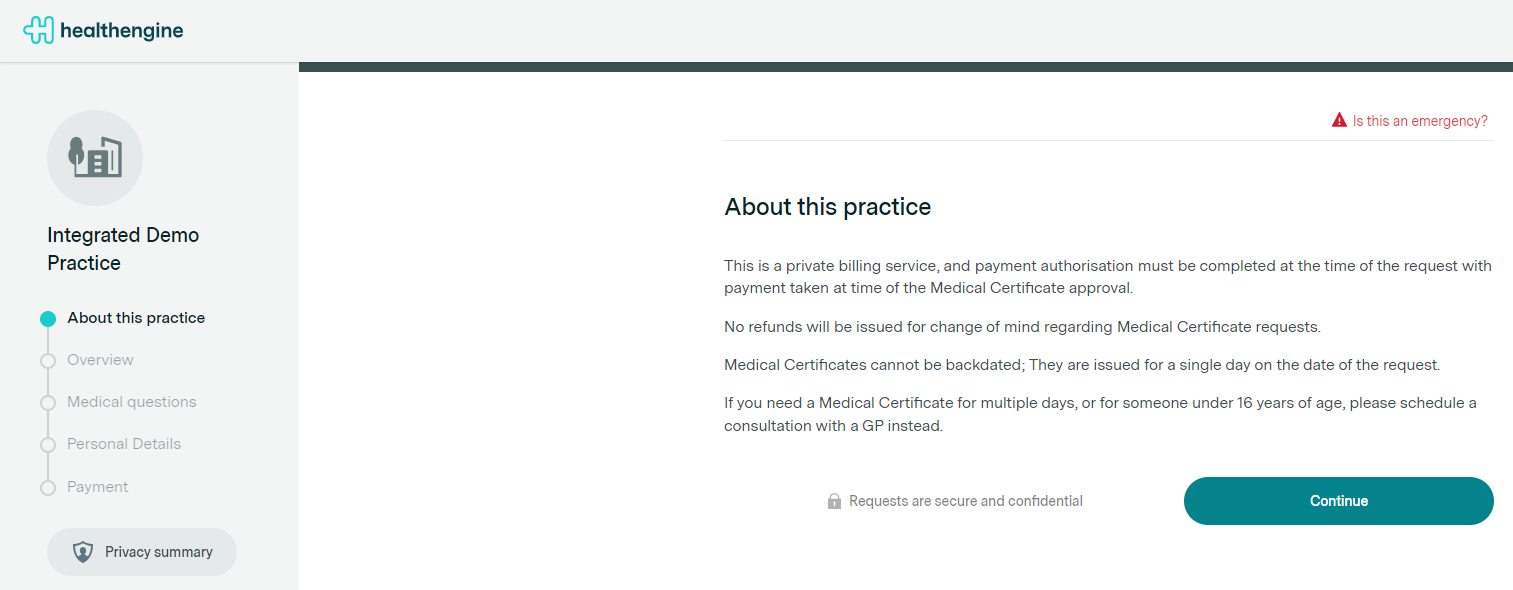 The first page you see is the Practice's Medical Certificate policy page. This is where the practice communicates various policies and information to you based on how they approve and action the medical Certificate.