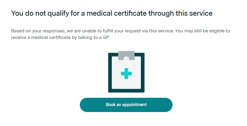 At the end of the 12-hour window, you will either have received your approved Medical Certificate and a receipt, or you will receive an email saying your request was not successful, giving you time to either book an appointment or obtain a Medical Certificate elsewhere.