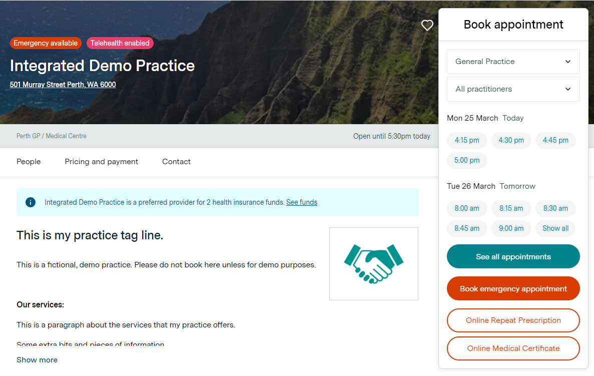 If your practice has enabled the Medical Certificate Product with Healthengine, an option will appear on the practice's profile "Book Appointment" menu that says "Online Medical Certificate". Clicking this button will take you directly to the Medical Certificate request form.
