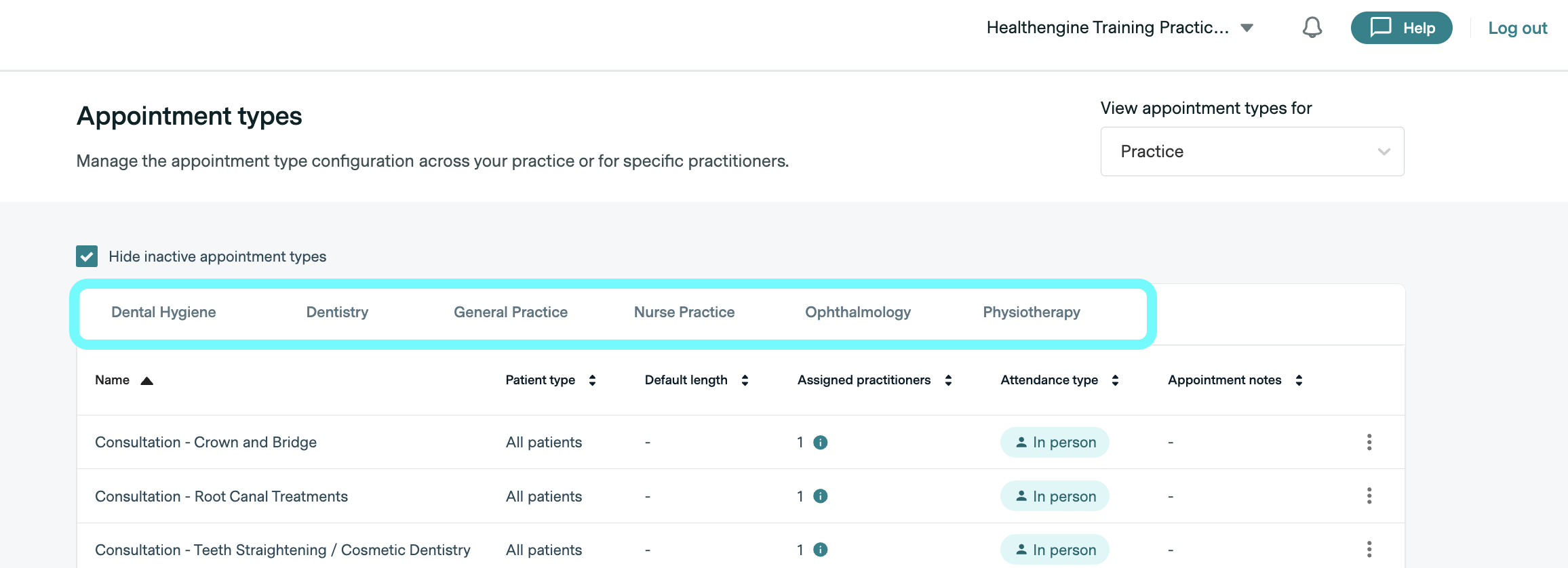 You will then come to a page that lists all the specialties added to your practice's profile at the top (as shown outlined in blue below), and any appointment types added for each specialty are shown when you select it:
