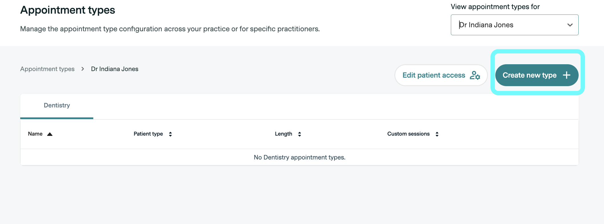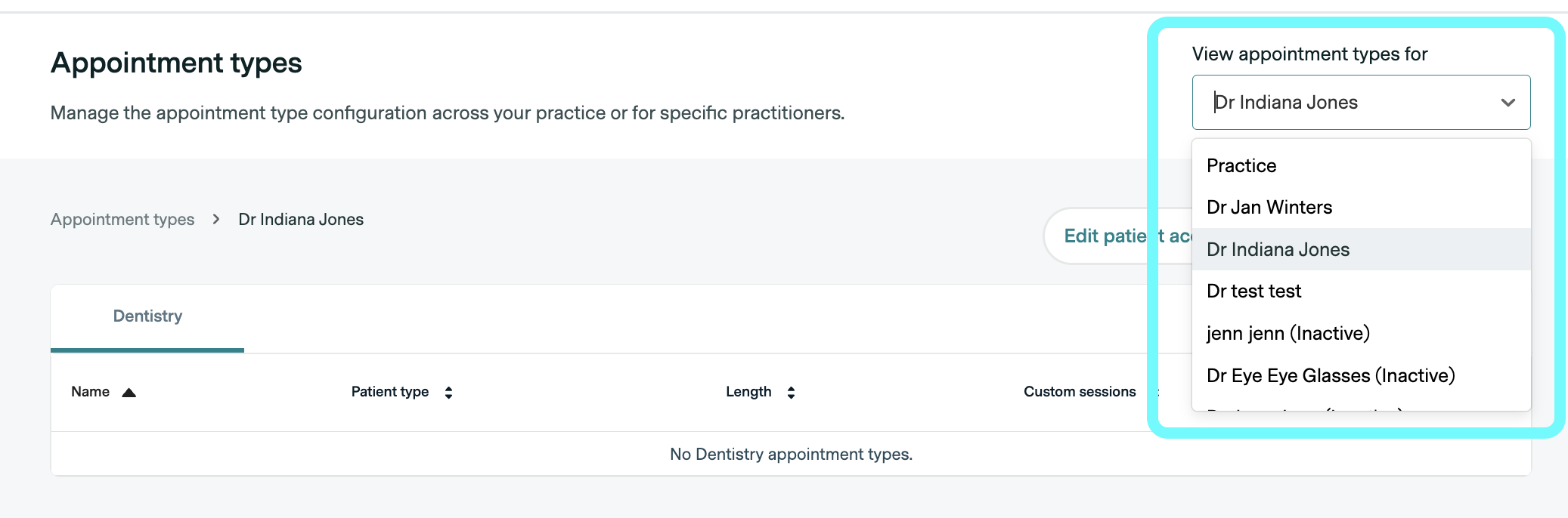 To add an appointment type to a practitioner, first select the practitioner from the menu (shown outlined in blue below).