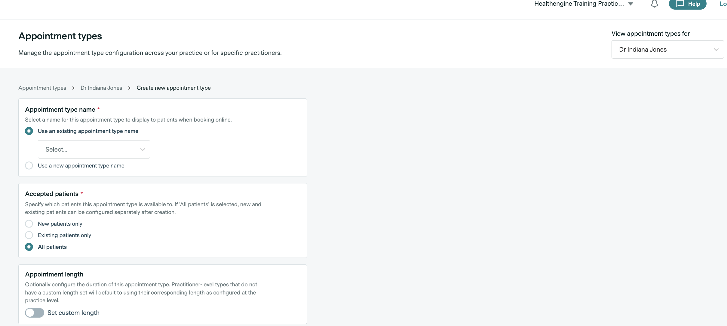 - The first box for Appointment type name allows you to either select from a list of appointment types already added (for GP, it is an extensive list of all GP types, not just the ones listed at your practice), along with the option to use a new appointment type name that allows you to freely type your appointment type name.