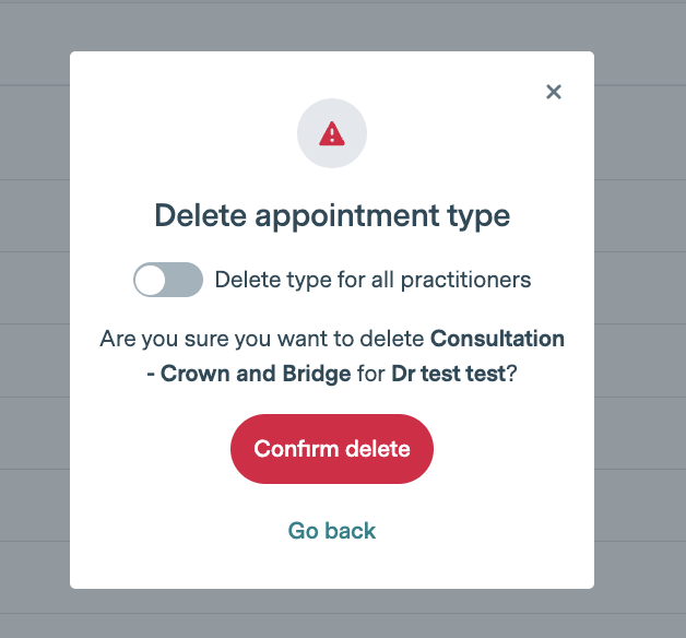 You will be asked to confirm if you'd like to delete this appointment type, and if you would like to delete it from all practitioners at the same time, use the toggle as shown below. Then click Confirm delete.