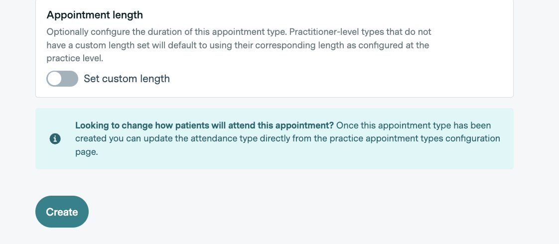 To save your changes and create the appointment type, click the 'Create' button in the bottom left-hand corner of the page, as shown below.