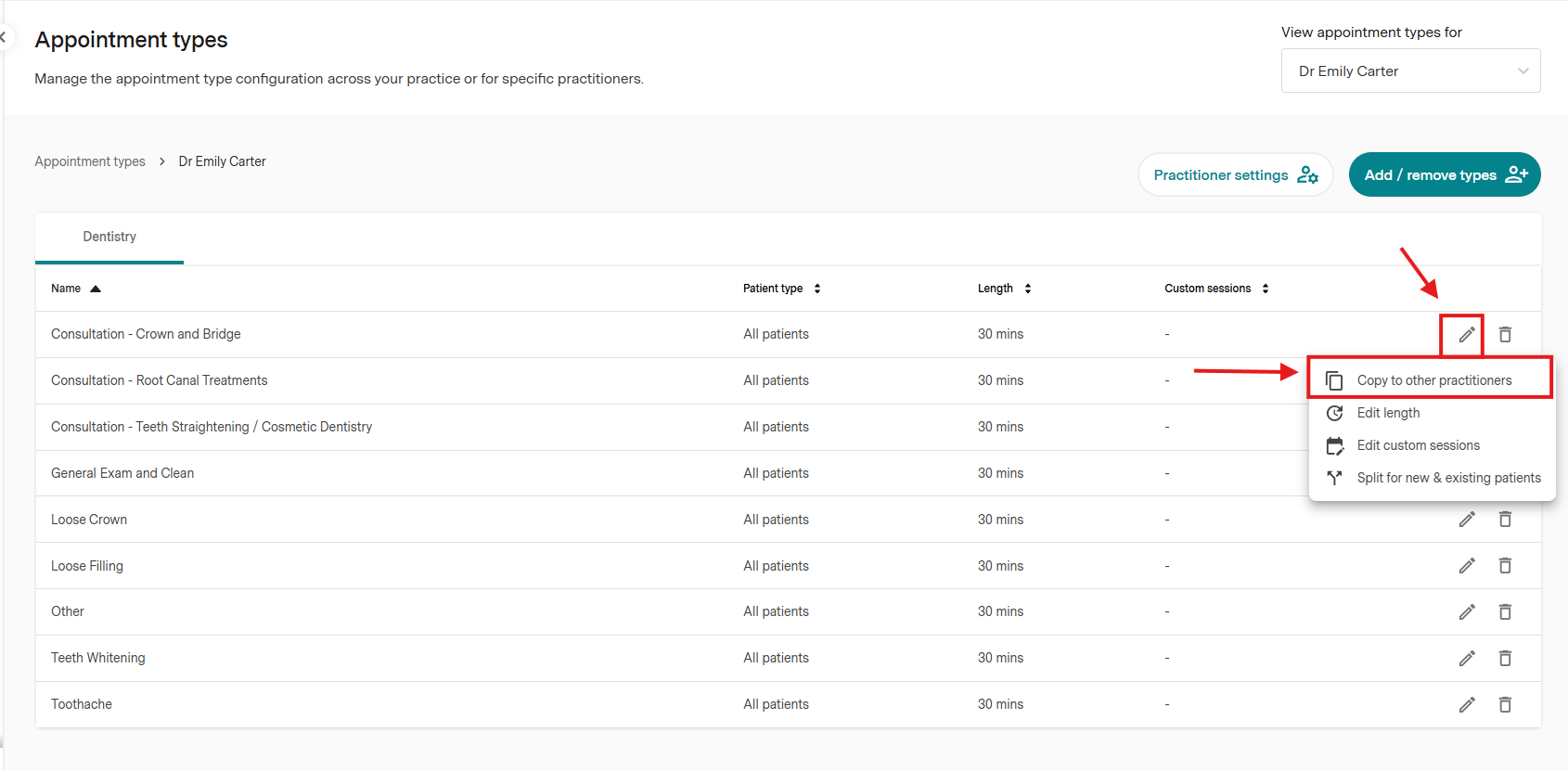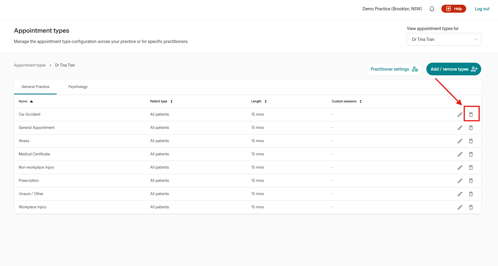 To add, edit or remove an appointment type from a practitioner, simply navigate to 'Appointments setup' and then 'Appointment types' in your Practice Admin Portal.