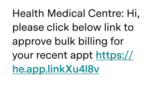 We recommend that you inform the patient at the time of appointment that they will receive an SMS from Healthengine requesting them to click a link to verify their identity and approve the bulk billing of their appointment, otherwise, this may be treated as a privately billed appointment.