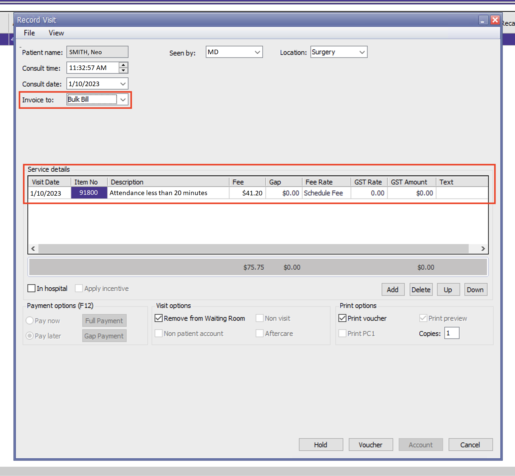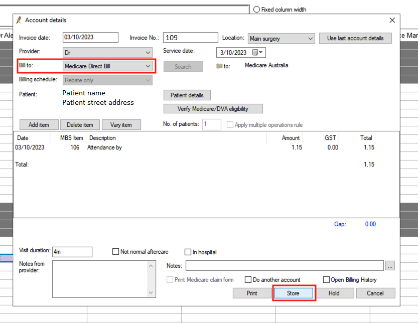 5. Invoice the appointment directly to Medicare: selecting either 'Store' or 'Hold ' will trigger the SMS request to send to the patient.