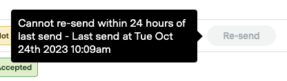 If the 'Re-send' button is greyed out, you'll see the below message when you hover over the button as we limit the re-sending of SMS to 1 send per day.