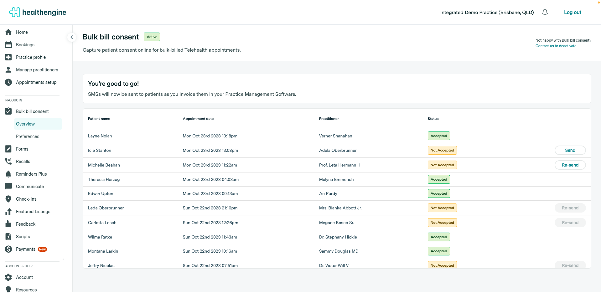 All SMS requests sent to patients can be viewed on Bulk bill consent's Overview page in your Practice Admin portal.