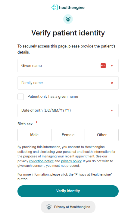 - The patient is asked to verify their identity; we use the same verification process as our Recalls and Check-ins product to ensure compliance with RACGP guidelines