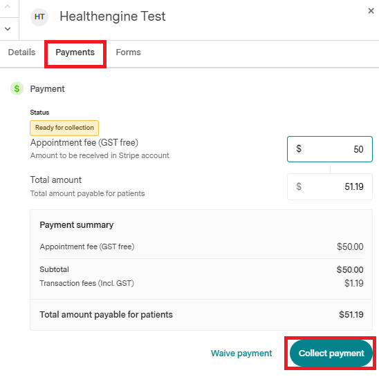 - If you wish to absorb the transaction fee, adjust the total you collect until the amount payable by patients at the bottom is correct.