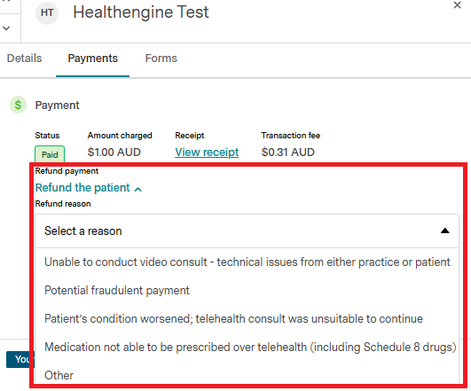 - Click “Refund the patient” to expand the menu and select a reason from the dropdown menu and click request refund.