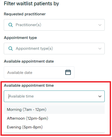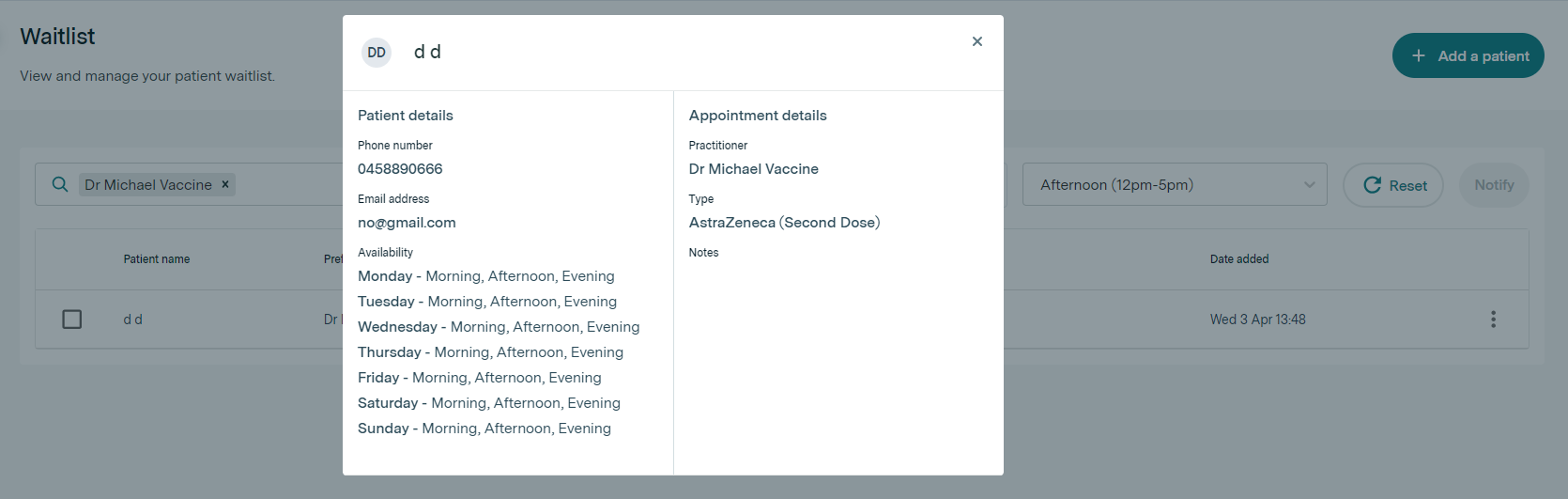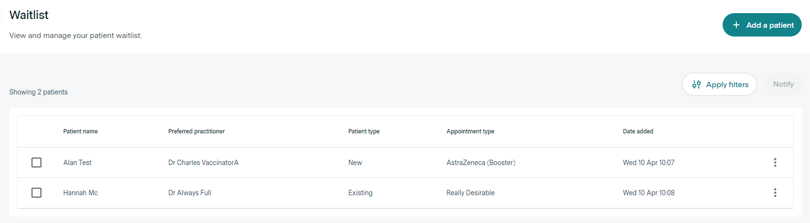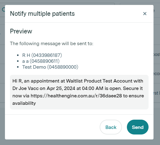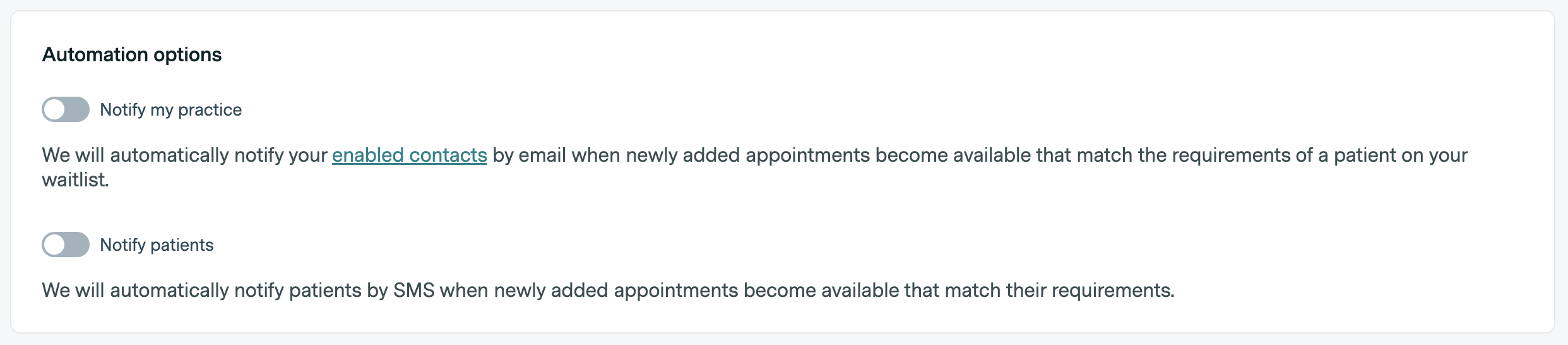 Turning this option on will notify the nominated practice staff when there is one or many patients on the waitlist that matches an appointment slot that has become available, allowing you to select which patients you want to notify about this availability.