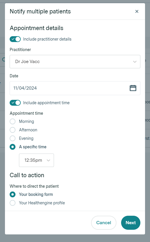 Once selected, click the "Notify" button in the top right. This button is grey until at least one patient entry has been selected. You can then see the message creation screen, that allows you to customise certain elements of the SMS you will send. You can customise the practitioner name, the appointment time and where the patient is directed to book on your Healthengine network.