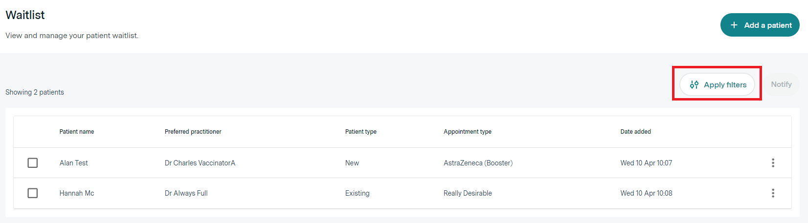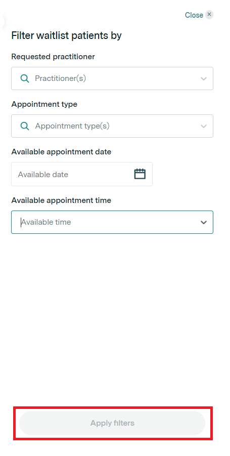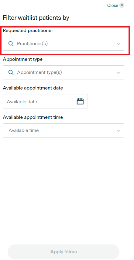 Some practices might have a lot of patient requests in the waitlist, and it can be hard to find certain patients or those matching certain criteria. There are a number of filters that can be applied to help find suitable patients when a cancellation occurs. These search filters work across all the entries, so if there are multiple pages of waitlist entries, all eligible patients will be shown. To open the filters menu, click the "Apply Filters" button in the top right.