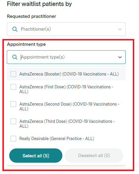 The appointment type search brings up all the available appointment types at your practice, and allows you to select multiple types to see patients that match those results.