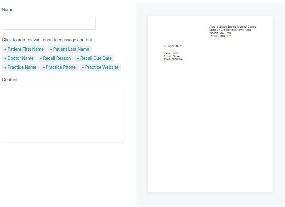 In the ‘Content’ box, add the body text of the recall letter. You can use the recommended 'relevant code' to add message content that will prefill the letter with information specific to the patient - this will save you from manually customising each Letter recall you send.