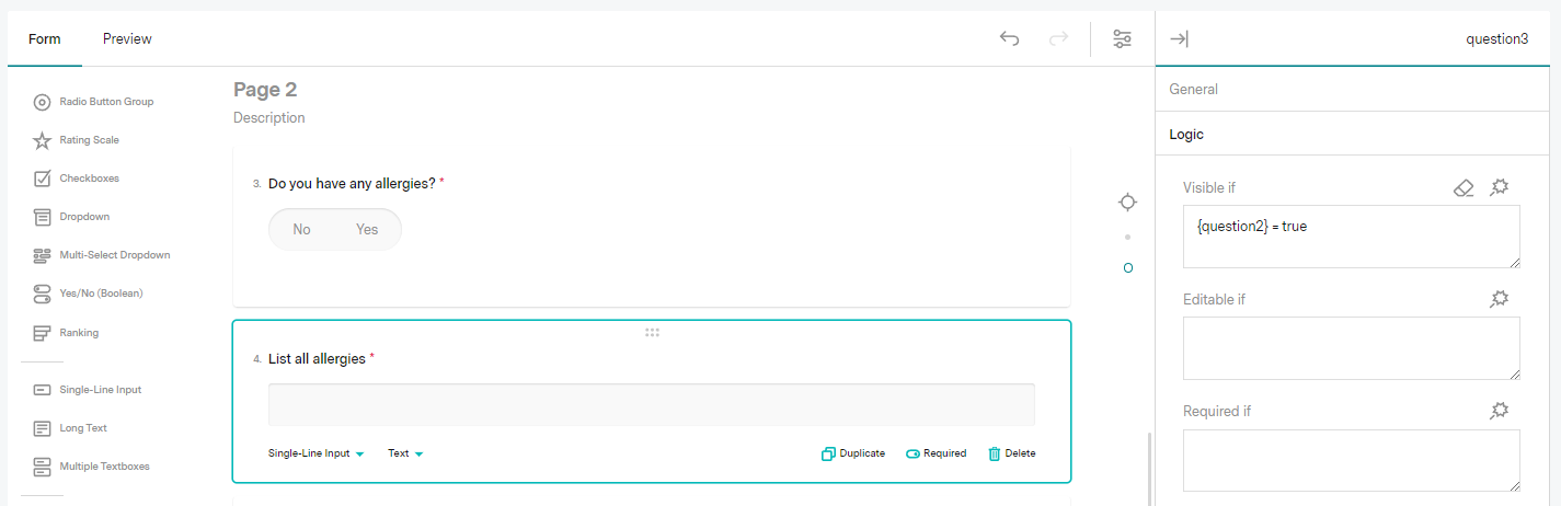 7. You can make this question mandatory for those who answer 'Yes' by toggling on the 'required' section within the "List all allergies" question box; located next to 'Duplicate'.
