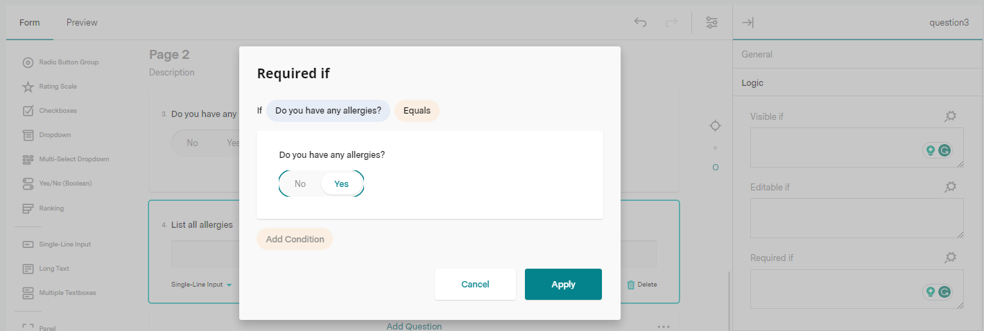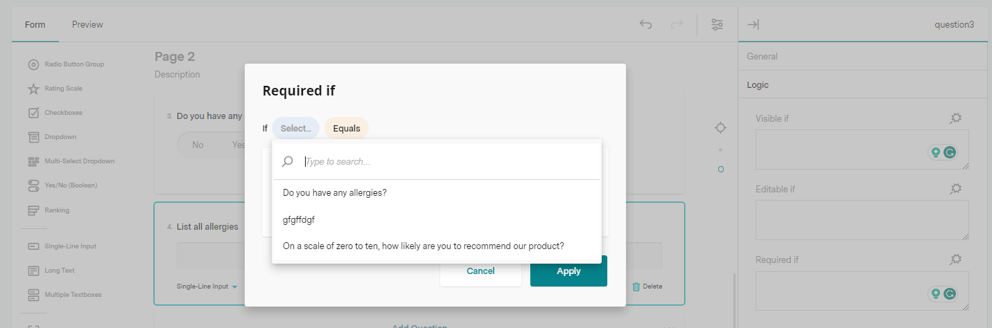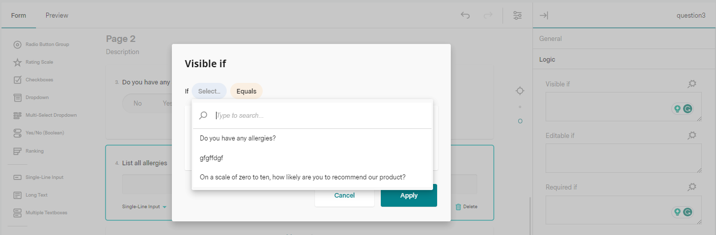 4. Click 'Select' and choose the question you want this question to conditionally appear for: "Do you have any allergies?"