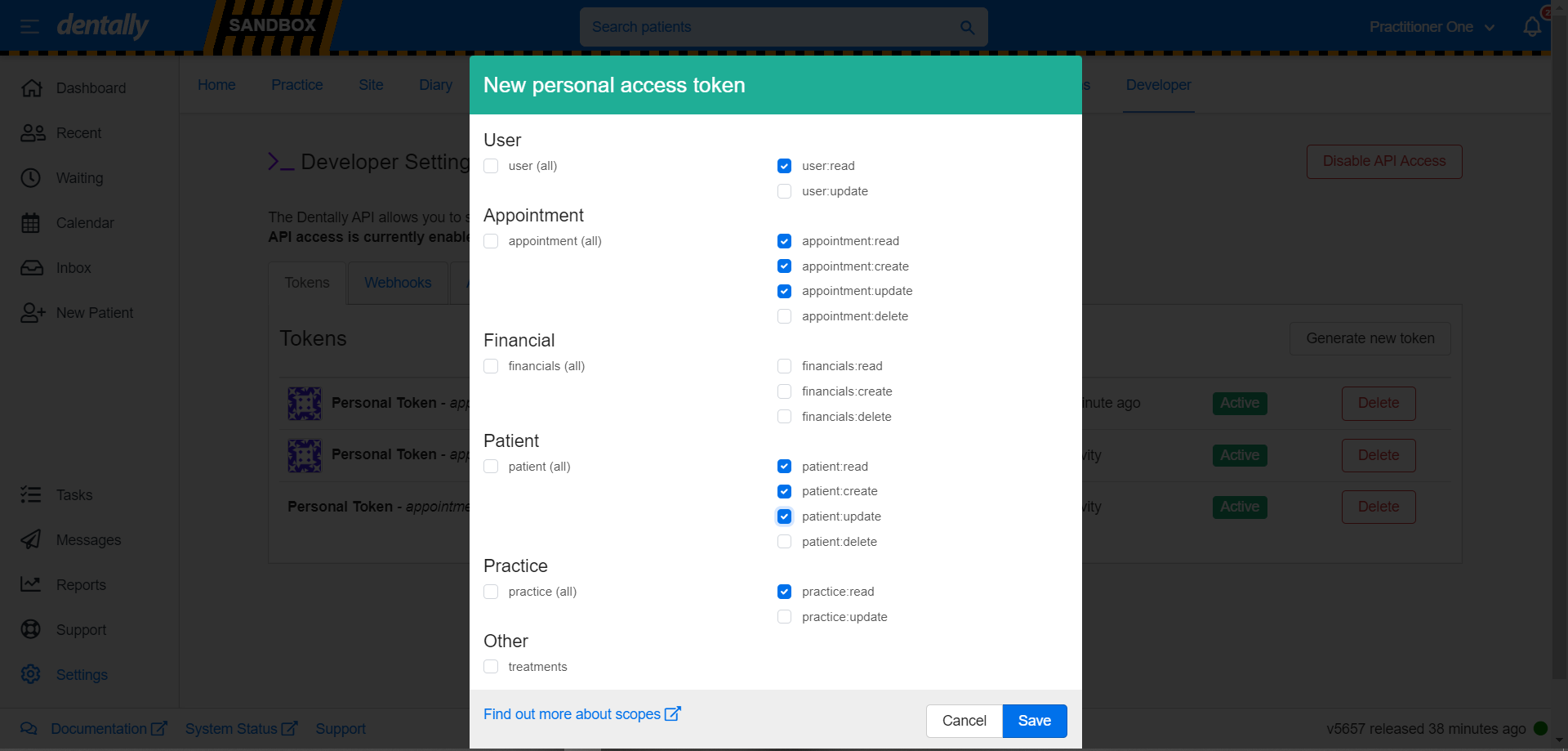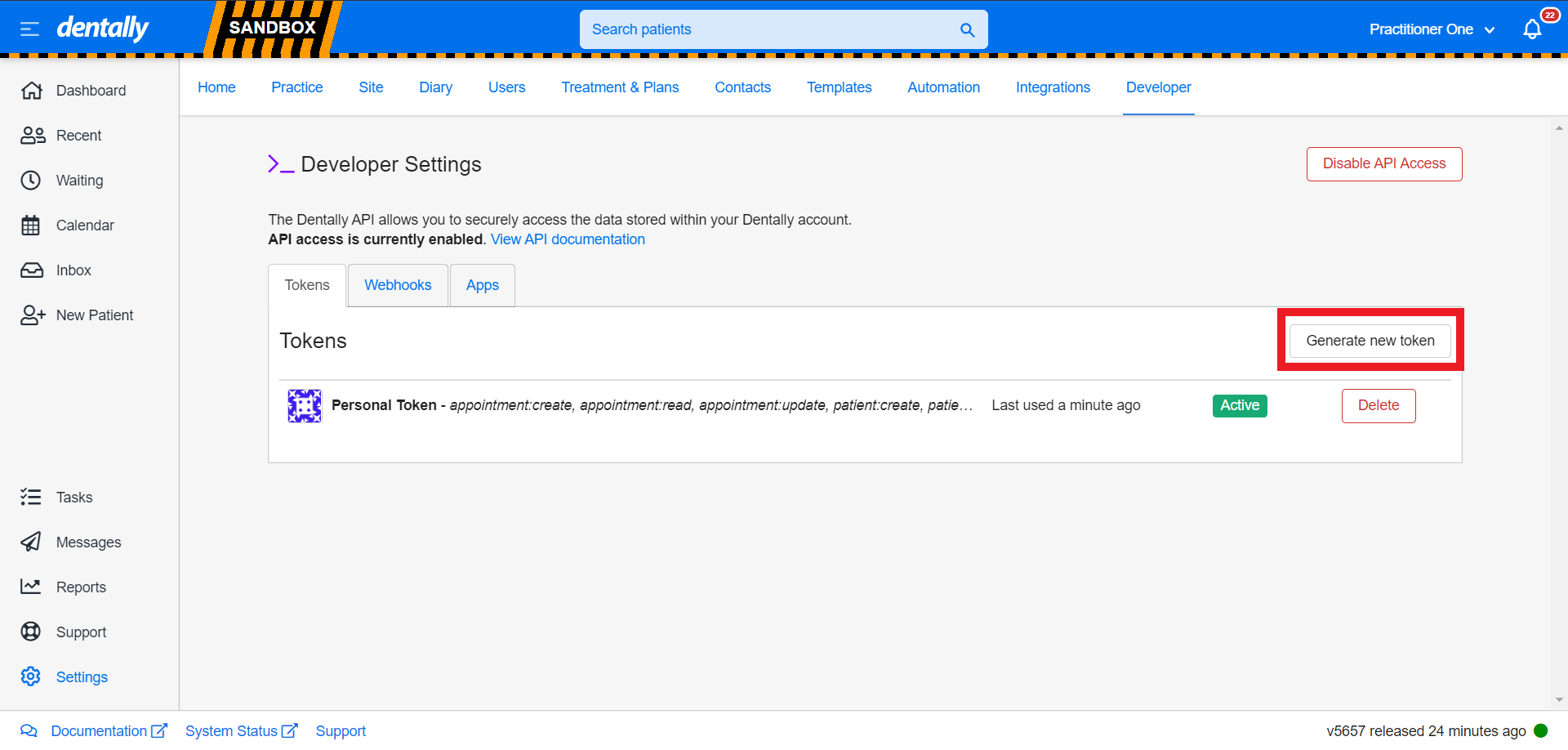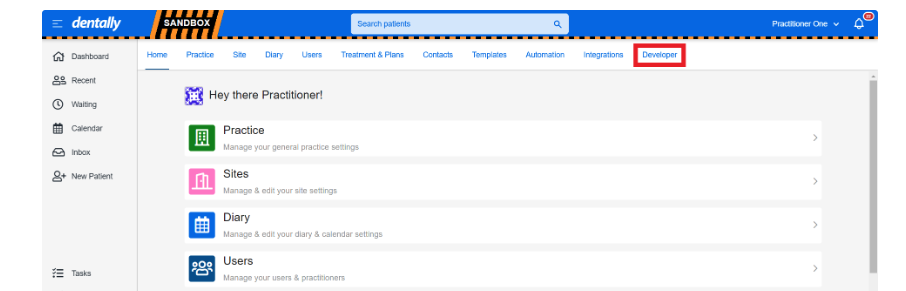 Log in to the Dentally dashboard and click ‘Settings’. Navigate to the ‘Developer’ tab.