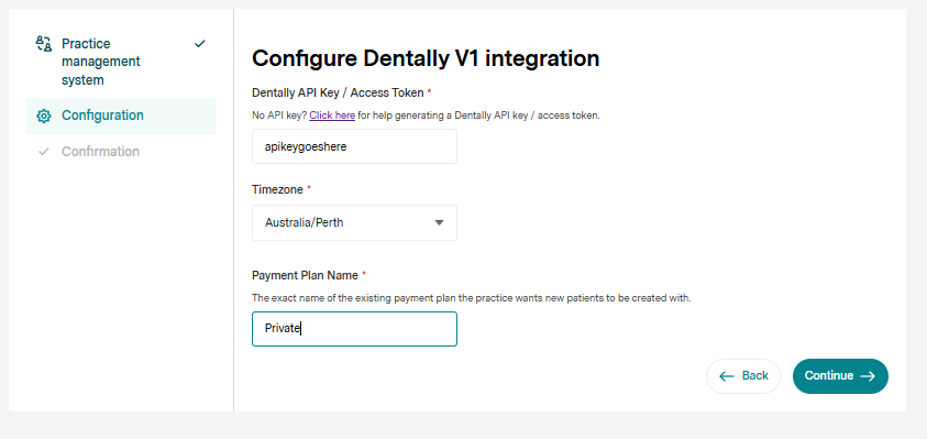 And paste the API key you obtained earlier from Dentally into the first box and select your Timezone and the payment plan you wish new patients to be created with, such as Private and click Continue.