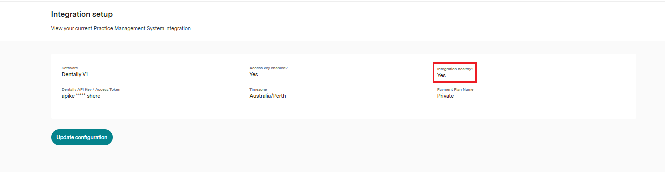 Congratulations, you have now added an API key from Dentally to your Healthengine profile. You can confirm this is up and running by refreshing the Integration Setup page after a few moments, and you should see" Integration Healthy? show as Yes".