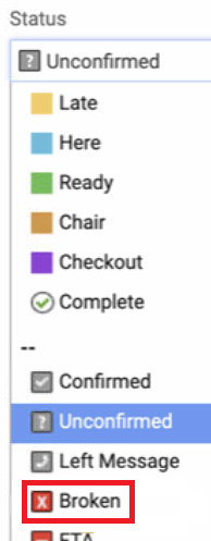 When they call, you must manually remove the appointment from your appointment book; this will redisplay the time online for someone else to book. In Dentrix Ascend, you can do this by marking it as Broken or Failed to Attend. That way, you can look back on these appointments if needed. To mark an appointment as Broken, you click into the status and change it from 'Unconfirmed' to 'Broken'.