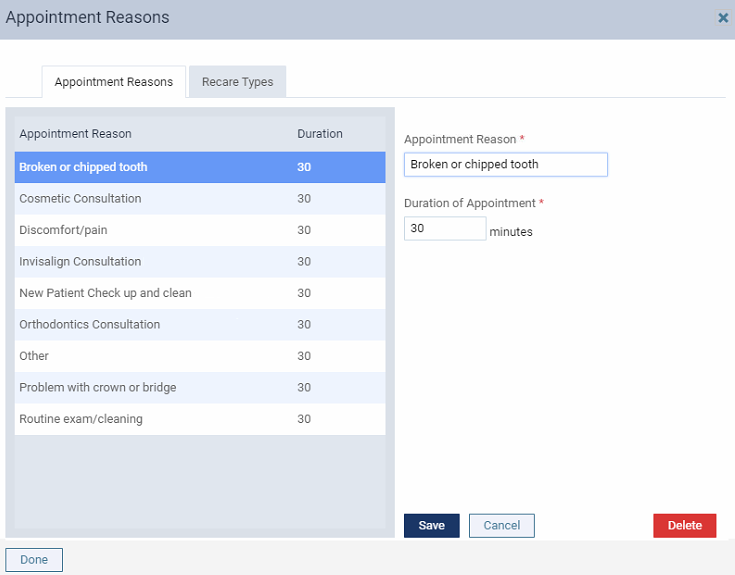 In Dentrix Ascend, the appointment reasons are found under Settings -> Scheduling Template -> Appointment Reasons. The reasons and lengths are set for all practitioners.