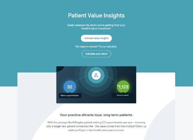 Your practice attracts loyal, long term patients. With the average Healthengine patient making 5.3 appointments per year - incurring only a single new patient connection fee - the value comes from the multiple follow-up visits you'll get in the months and years to come.