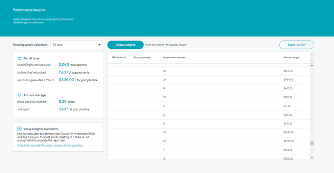 If you're looking for a way to measure your ROI (Return on investment) for every new patient fee paid to Healthengine, then the Value Insights report is the feature for you!