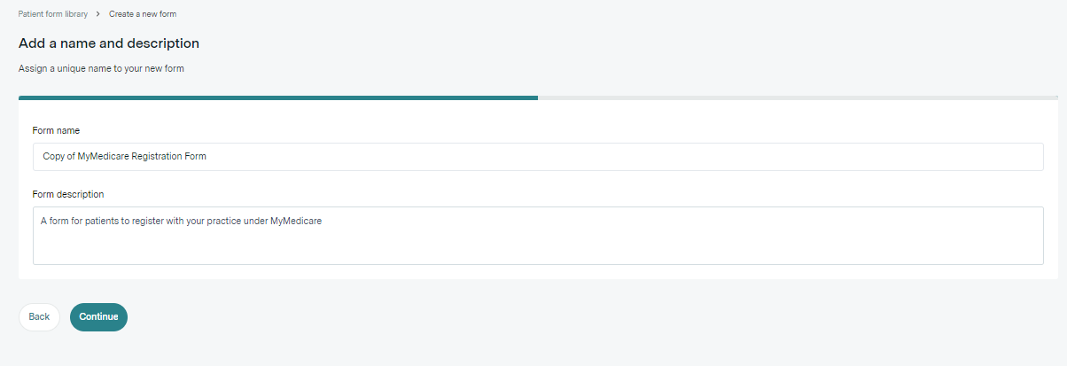 Note: The form name is patient-facing and will be included in the 'request to complete form' email that's sent to patients when sending the form via Practice Admin. The form description is internal and will not be visible to patients.