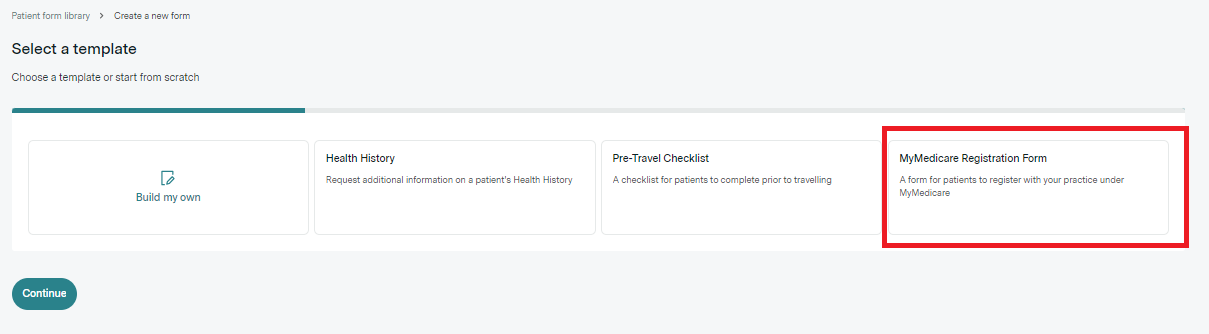 - Select the MyMedicare Registration Form template from the menu options and press continue.