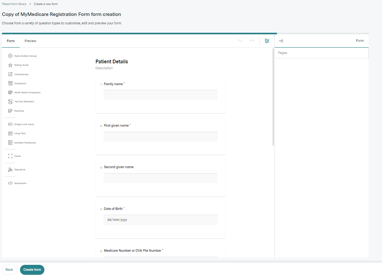We recommend not making any changes to this form, as it has been created to match the current MyMedicare patient registration form provided by the government here, this form includes all relevant legal disclaimers. If you wish to preview the form, click preview in the top left to see the form as a patient would. - Press 'Create form' at the bottom left of your screen to create and save your form.