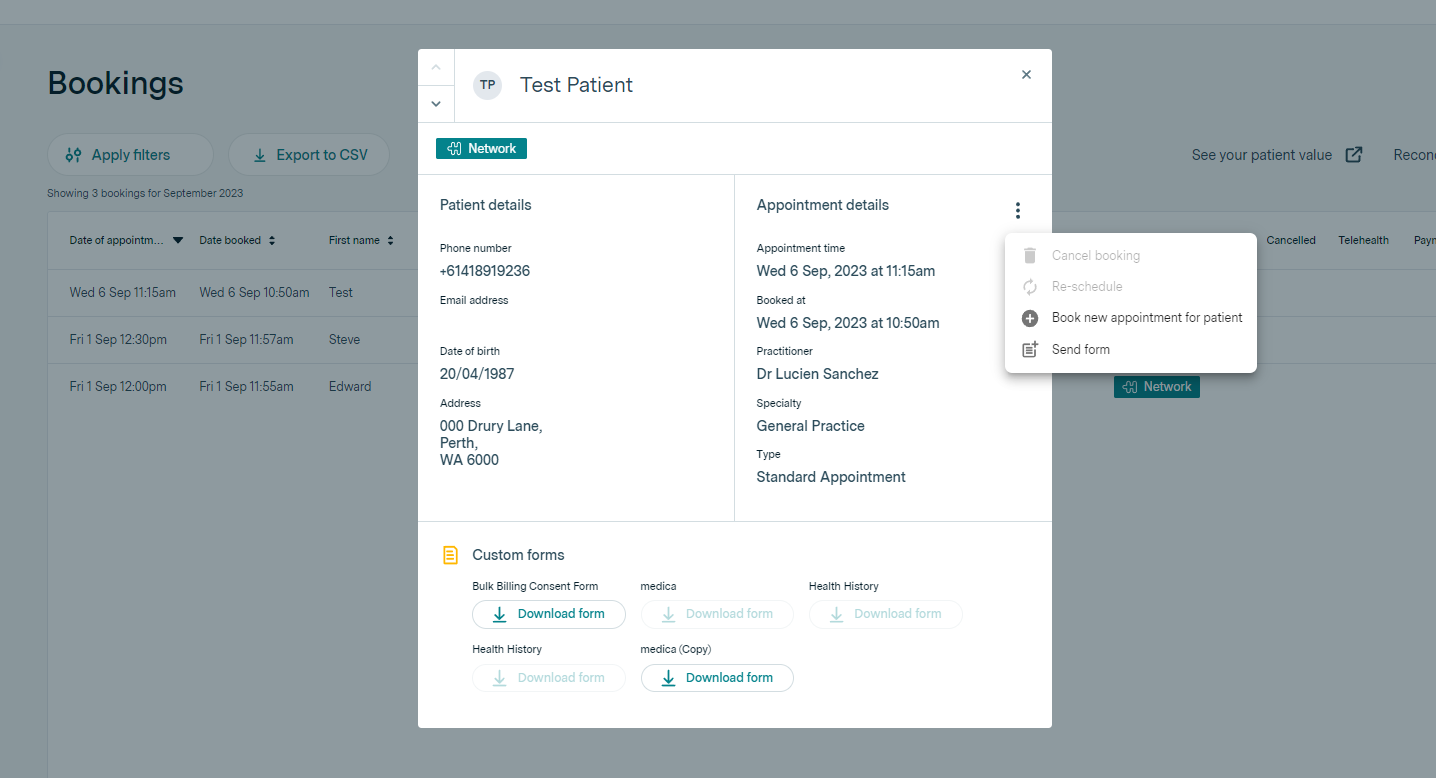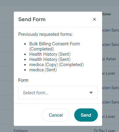 - Send a form to a specific patient from the Bookings table Practice Admin