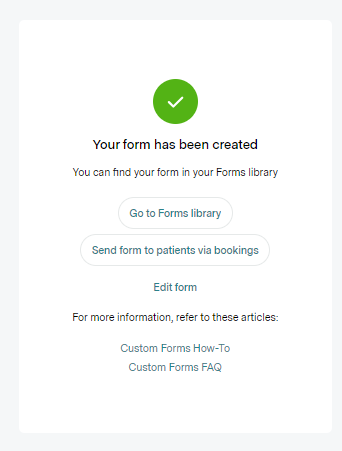 - Once your form has been successfully created, you will see the below success message indicating that you can now send this form to your patients.