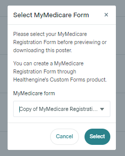 - The first time your try and view or download the poster, you will be asked to link your already created MyMedicare custom form to the poster. Select the relevant MyMedicare form from the dropdown menu, and click 'Select' to generate and download your practice poster with the QR code linked to your MyMedicare custom form.