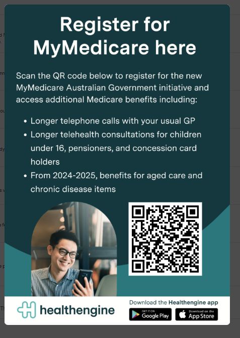 In addition to the QR poster, Healthengine has other resources for you to use at your practice to showcase the benefits of MyMedicare to patients. Please refer to this page for more details and locations for the downloadable resources.
