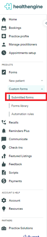 Please note: For any submitted form that was originally sent to a patient with a Healthengine booking via PracticeAdmin's Booking tab or a custom form automation rule, Healthengine will automatically attach a PDF copy of the submitted form to the patient's file in your PMS. This form will also be available to download in the Submited forms section of your Custom Forms in Practice Admin.