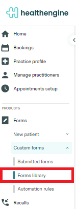 - Log in to Practice Admin, and select Forms -> Custom Forms -> Forms Library from the navigation menu.