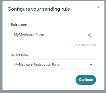 - Enter the rule name so you can reference the rule later, and select the form you want to send (In this instance, the MyMedicare form you created above).
