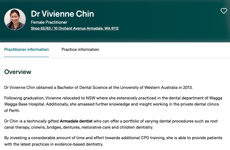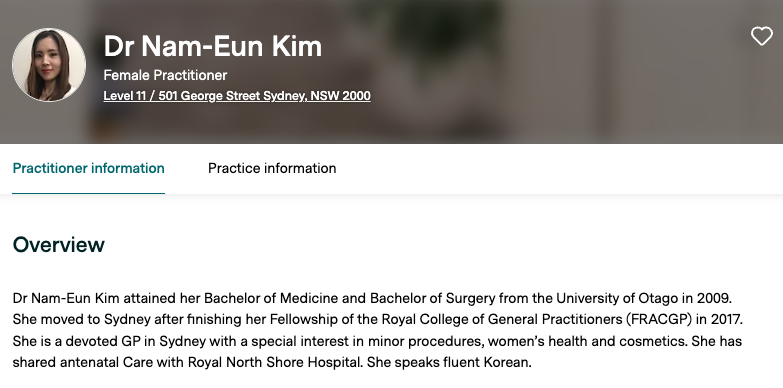 Screenshots are provided as examples only and the information may change over time. Please refer to the practitioner's profile on healthengine.com.au for their up-to-date information.