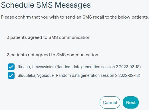 Once you are ready to schedule the SMS send, click on the ‘Send SMS Recalls’ button or alternatively, you can cancel the process at any time by clicking on the ‘Cancel’ button.