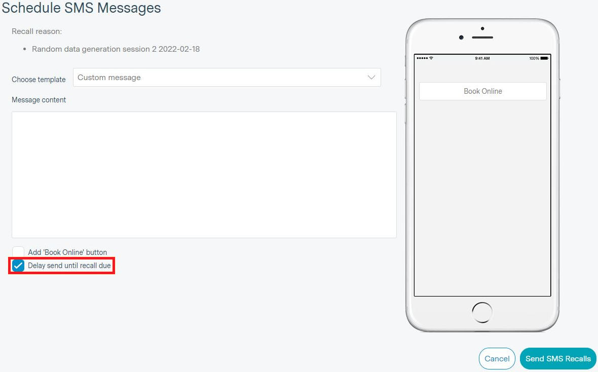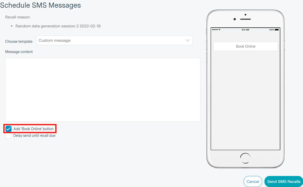 Please Note: You can also choose to add a ‘Book Online’ button! We recommend this box is checked for all SMS recalls as this allows the patient to book an appointment quickly and easily after viewing their recall message.
