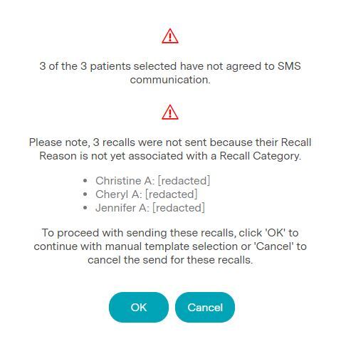 If you decide to continue regardless of this and click the ‘SMS’ button, you will get a pop-up message warning you that the patient you are trying to send an SMS to has not agreed to receive SMS recalls.