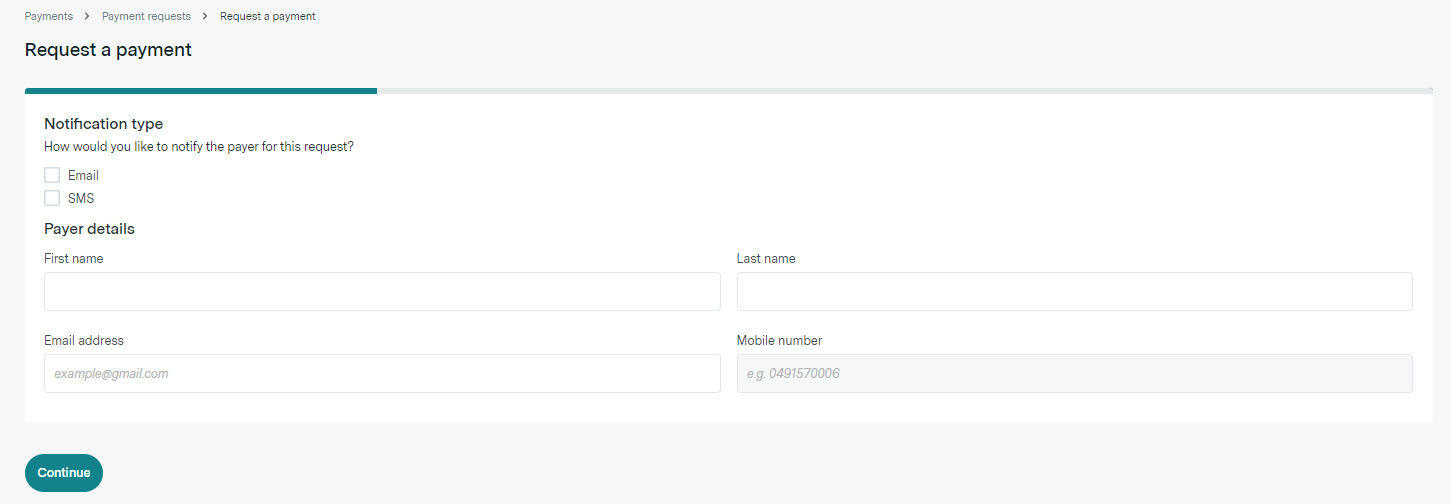 - You can choose how you want to contact the payee. If you select SMS, the mobile number field becomes available. In order to generate a request, we require at least one contact method