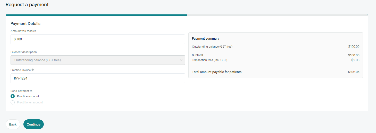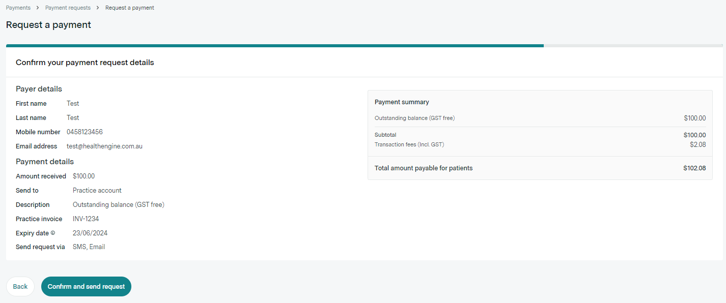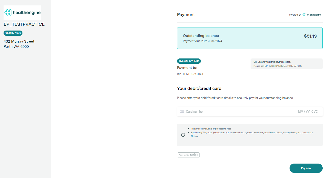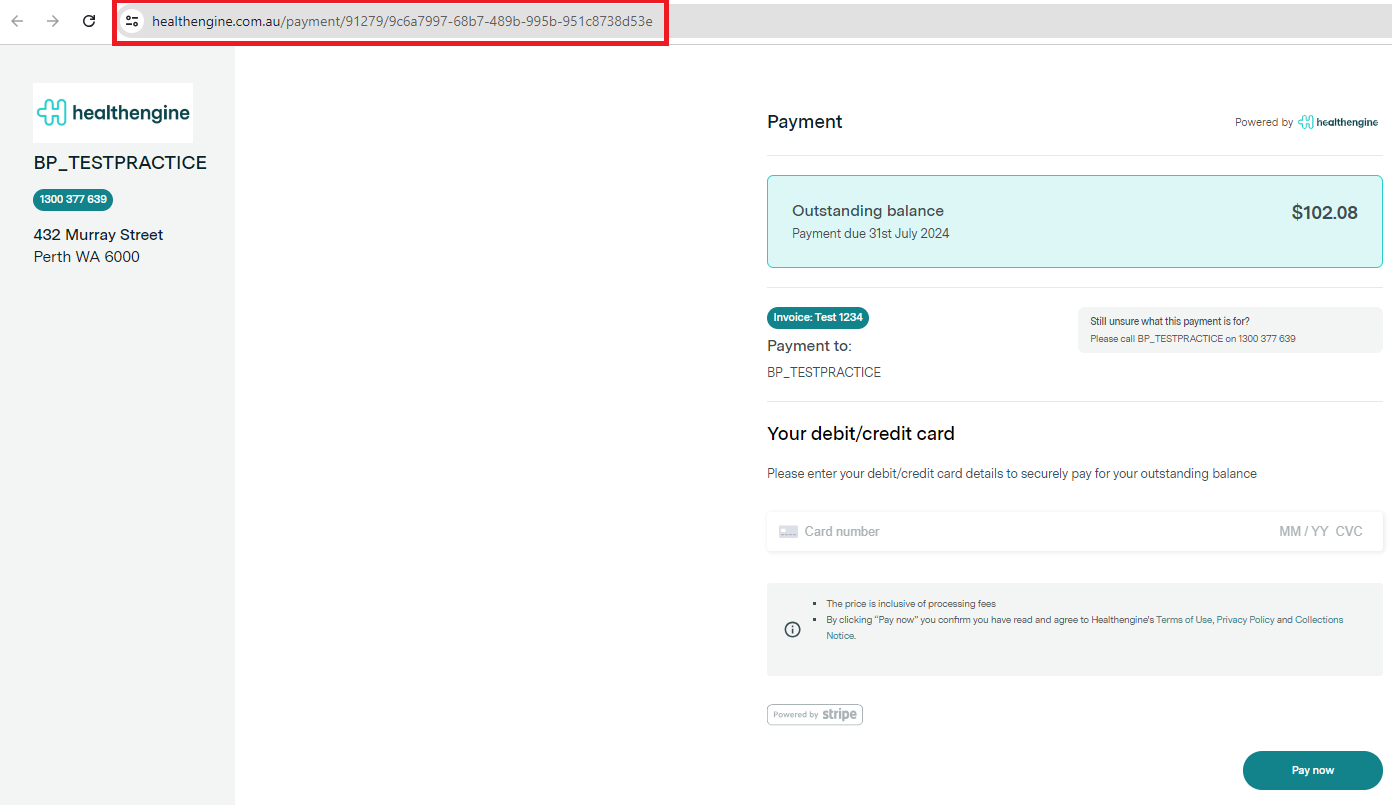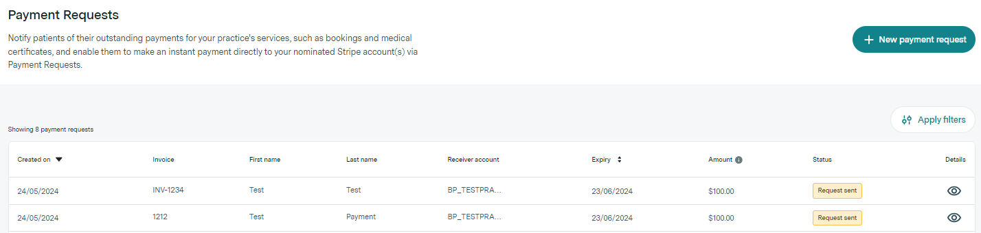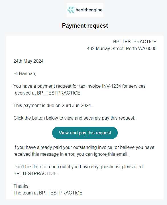 In order to use Payment Requests you need to have previously set up a Stripe account with Healthengine for your practice so that we can collect the payment on your behalf. More information on how to do that can be found here.